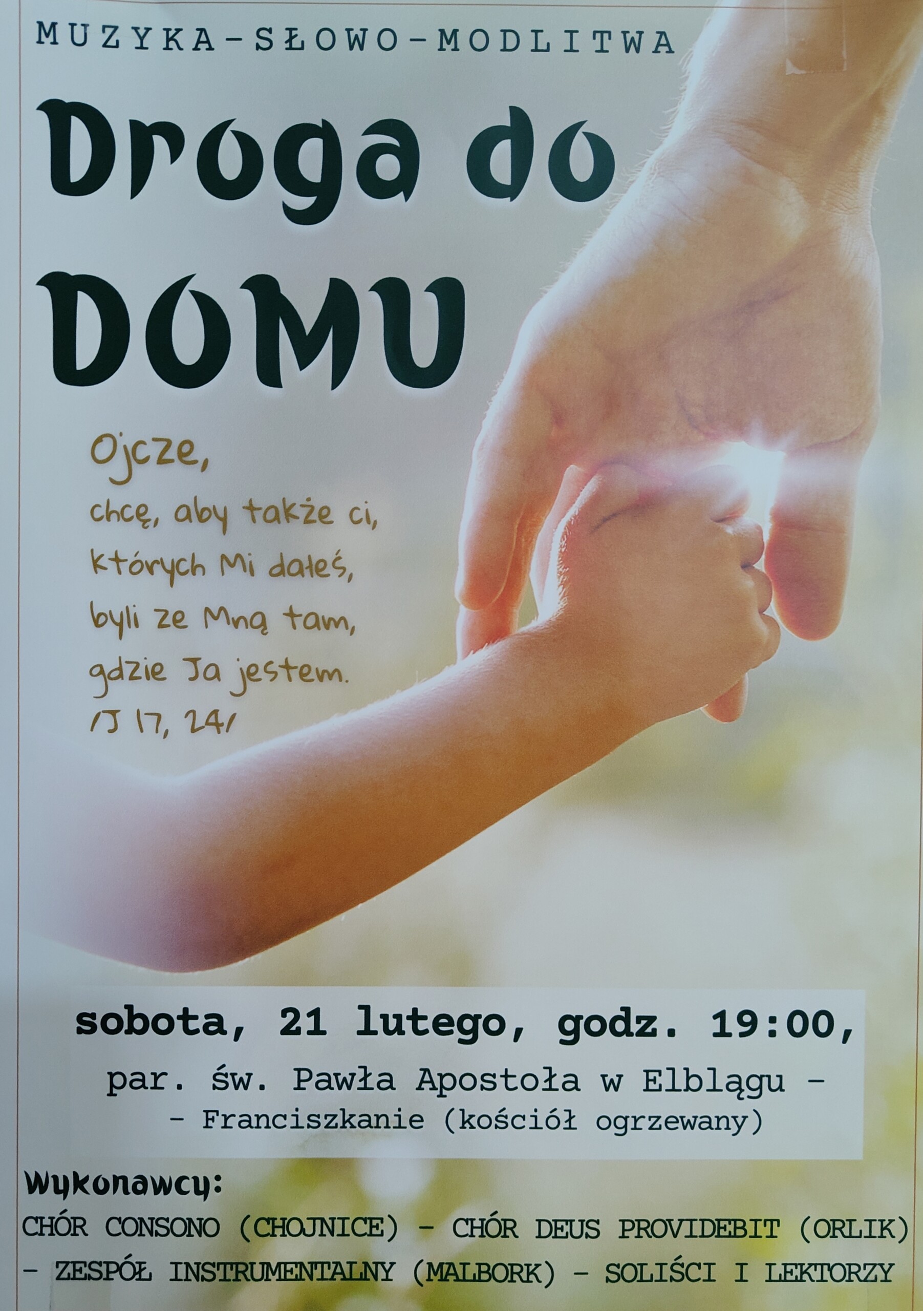 Zapraszamy do naszego kościoła w sobotę 21 lutego br. o godz. 19.00 na koncert "Droga do Domu!" w wykonaniu chóru i zespołu kameralnego z Tczewa.
